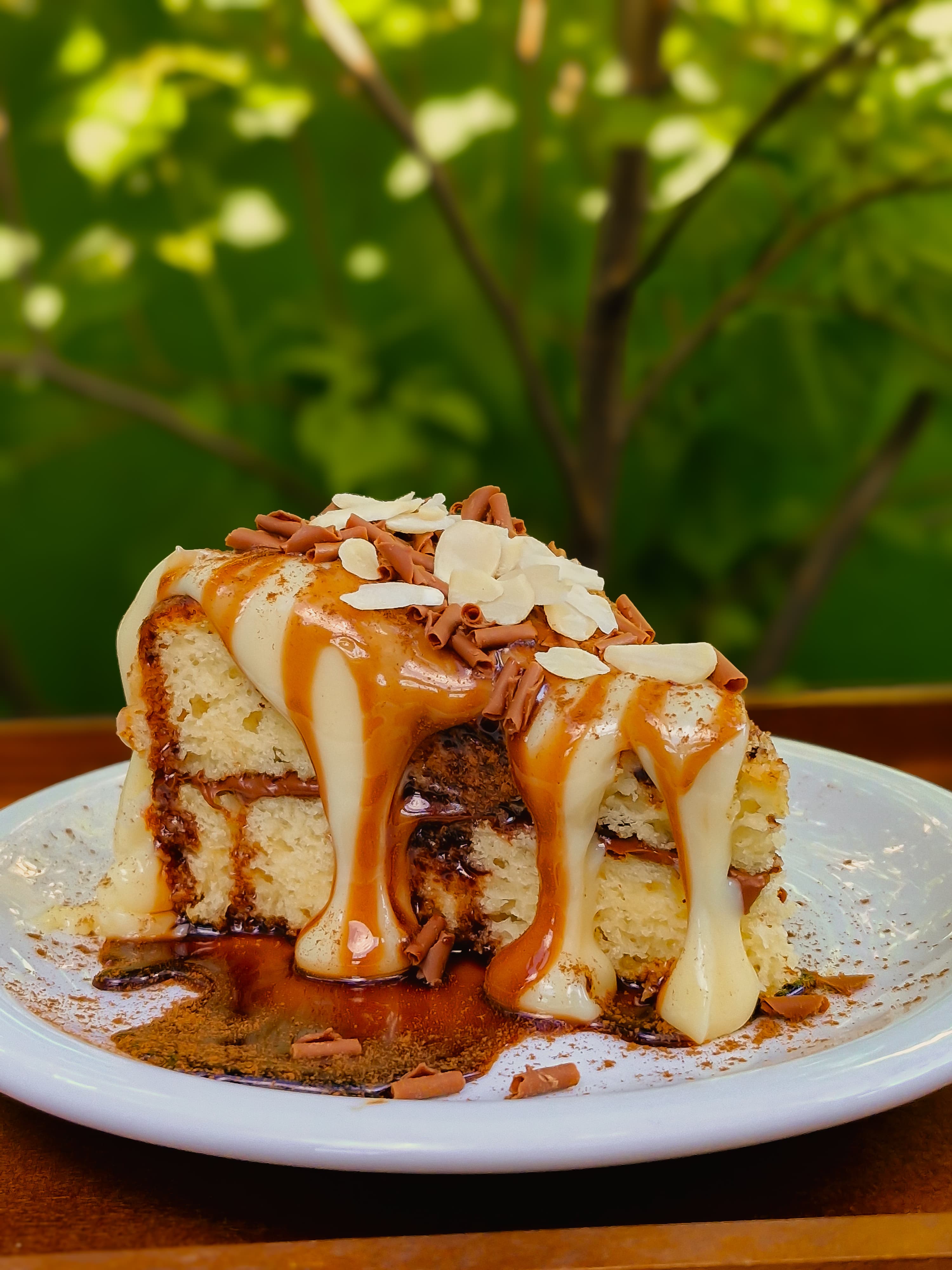 Tokyo Almond Amai ????????? Bolo de massa branca, recheado com creme de avelã e gotas de chocolate amargo. Com uma cobertura cremosa de leite condensado e calda de chocolate, é finalizado com raspas de chocolate belga ao leite e crocantes lascas de amêndoas tostadas.