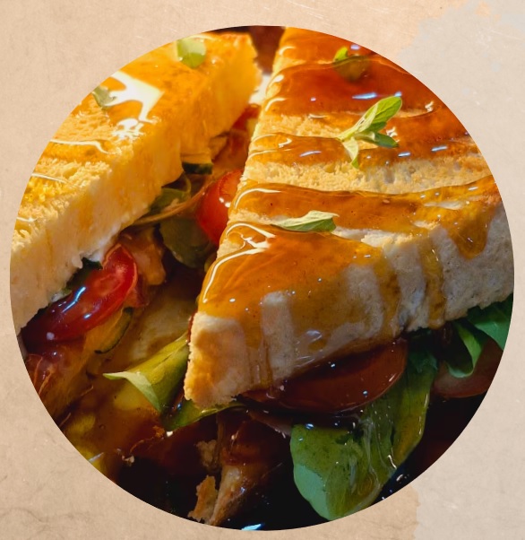 Shokupan Sando 2.0 ??? ??? 2.0 Shokupan tostado recheado com salame italiano, pepino japonês, creme de ricota, rúcula, tomate, mussarela de búfala, cebola roxa e molho de laranja oriental, finalizado com orégano fresco.