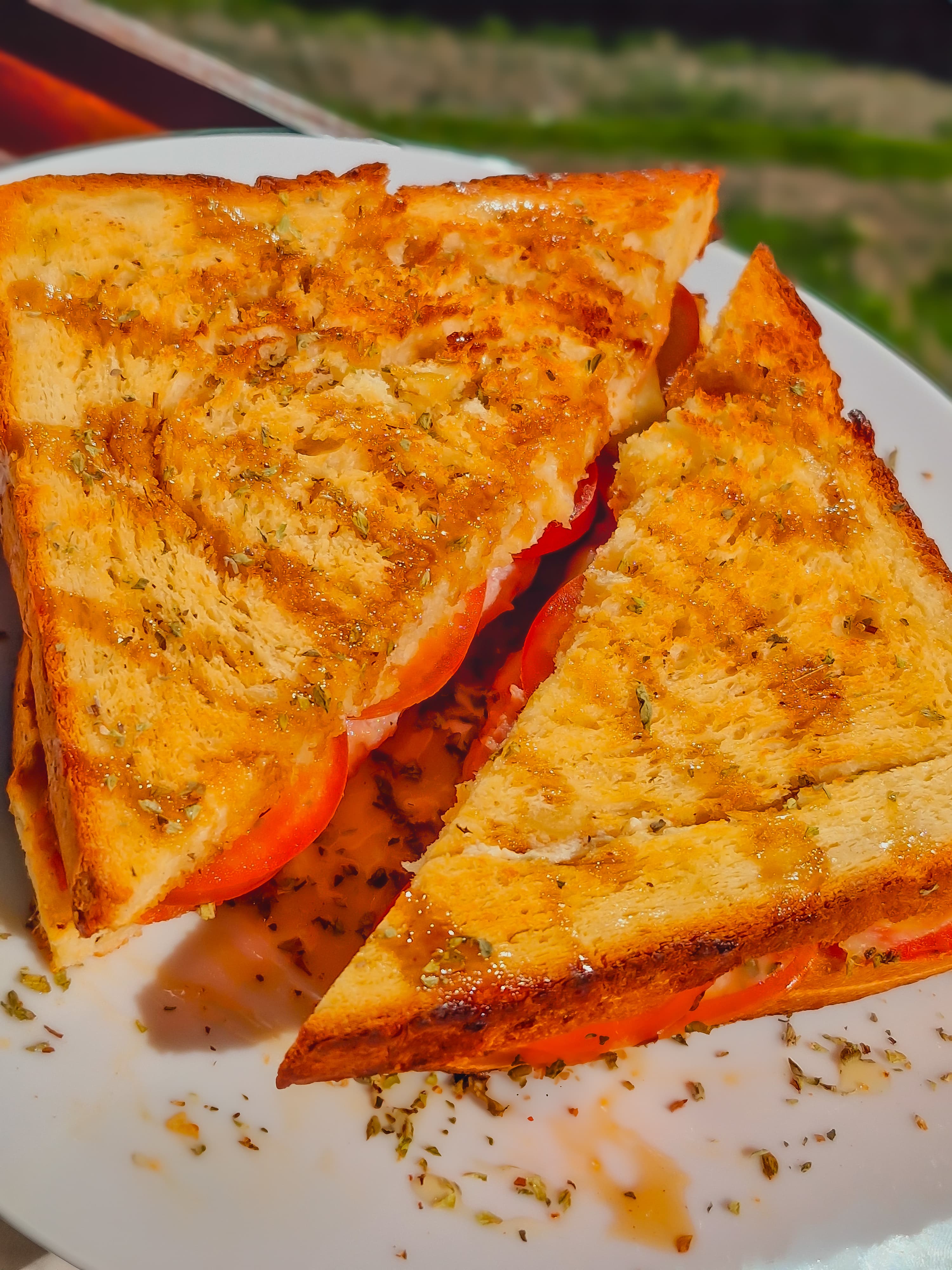 Shokupan Sando ?????? Sanduíche tostado feito com o autêntico pão japonês shokupan, recheado com queijo mussarela derretido, presunto e fatias de tomate fresco. Finalizado com uma pitada de orégano e molho Tokyo.