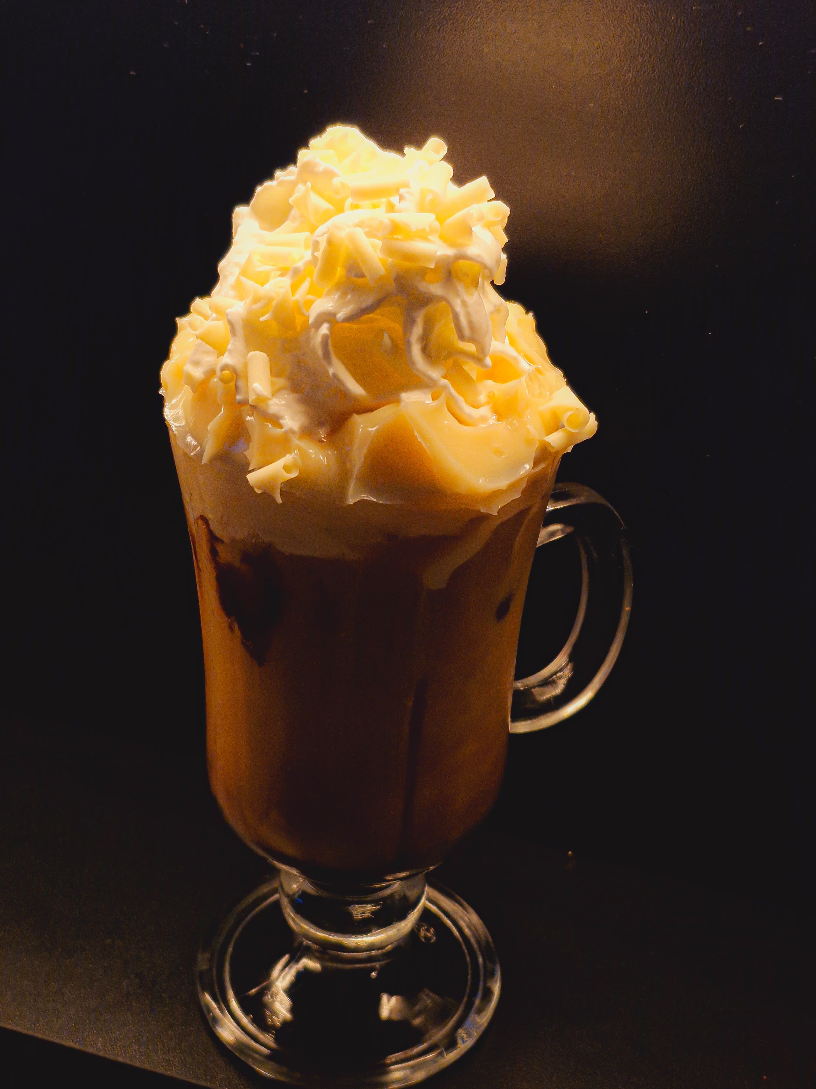 Frappé Shiro no Yume ??????? Creme de chocolate branco e leite condensado, leite cremoso vaporizado, sorvete de baunilha, café espresso Tokyo Cafe, com uma cobertura suave de chantilly. Finalizado com raspas de chocolate belga branco.